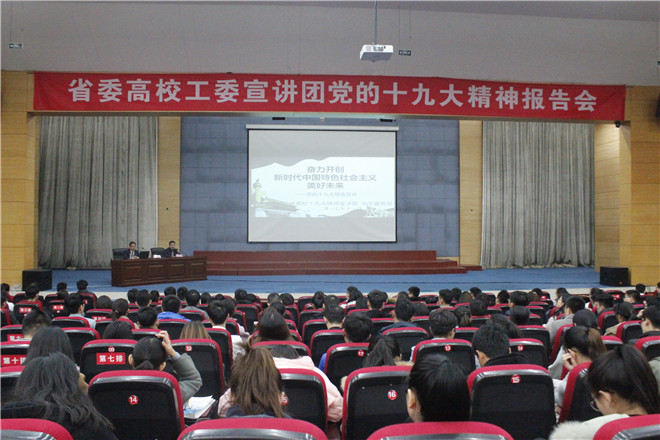 11月17日晚,省委高校工委党的十九大精神宣讲团进校园学生首场宣讲会在太白湖校区开讲。省委高校工委党的十九大精神宣讲团成员、我校马克思主义学院副院长毕于建教授为青年学子带来题为《奋力开创新时代中国特色社会主义美好未来》的报告。学生工作处处长陈吉义主持报告会。