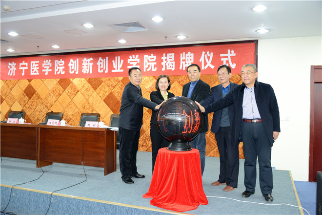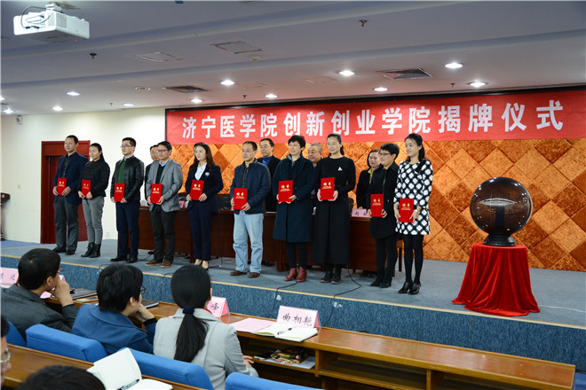 仪式上,与会领导为创新创业教育导师代表颁发了聘书,为济宁医学院创新创业学院揭牌触动水晶球。