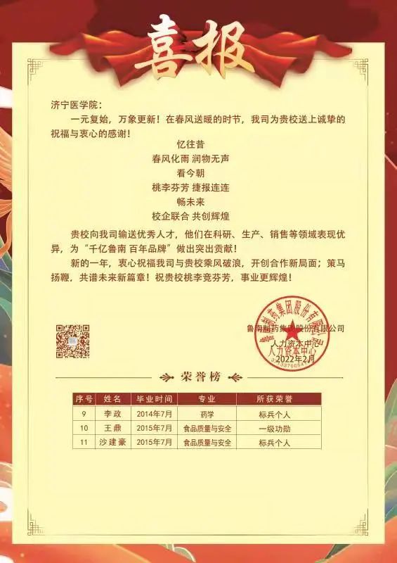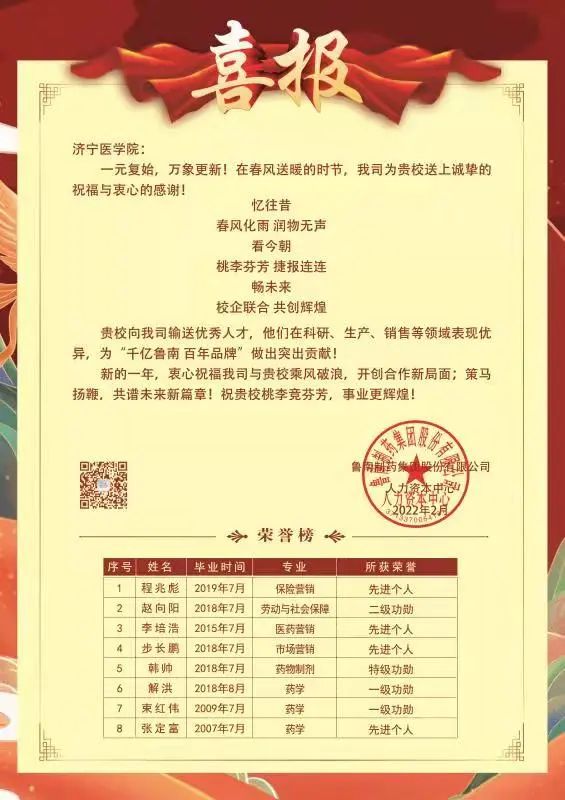 近日鲁南制药集团股份有限公司特地发来喜报,对学校常年为公司输送优秀人才表示感谢。我校优秀毕业生解洪、束红伟、王鼎3人获得“一级功勋”荣誉称号,赵向阳获得“二级功勋”荣誉称号,程兆彪、李培浩、步长鹏、张定富4人获得“先进个人”荣誉称号,李政、沙建豪2人获得“标兵个人”荣誉称号。