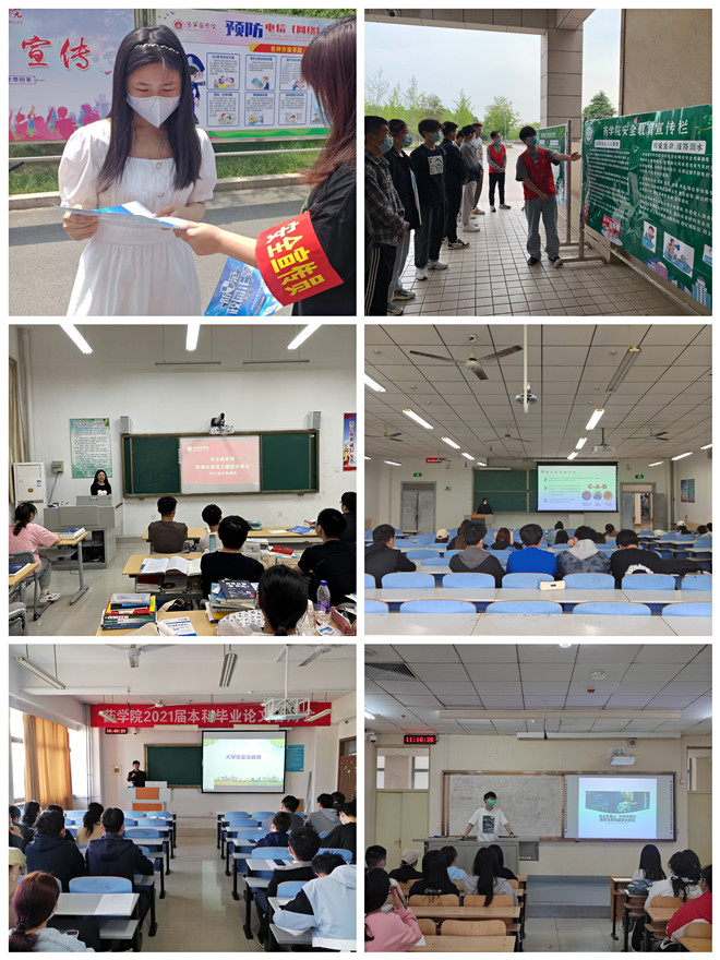 丰富宣传渠道,营造浓厚教育氛围。学生工作处、校团委、各二级学院紧紧围绕活动主题,广泛宣传防溺水、防欺凌、防火患、防诈骗及安全用电等知识。线下通过展板、条幅、宣传单等媒介,宣传安全知识,筑牢学生安全防线;线上制作了“济宁医学院大学生反诈知识科普”宣传视频,在校园餐厅、教室、超市等人流较大的地方循环播放,整理撰写多篇安全知识科普文章,在公众号、微博、网站、班级群等媒体平台广泛推送,增强学生安全意识,营造浓厚安全教育氛围。