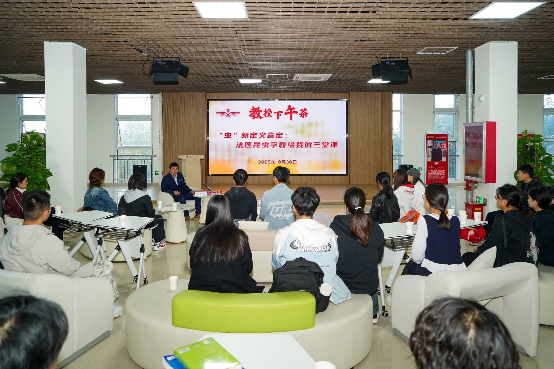 任立品以《“虫”新定义鉴定:法医昆虫学教给我的三堂课》为题,从法医昆虫学为切入点,带领师生走进这门特色鲜明的新型交叉学科,感受昆虫在法医学实践中的“沉默证言”。任教授结合自身科研与办案经历,分享了法医昆虫学带来的三大启示。一是要尊重自然时序,坚守规律之本,求学与做事亦如昆虫发育,需心怀敬畏、遵循客观规律,通过循序渐进夯实基础,方能从容应对各类挑战;二是要倾听微弱声音,洞察细节之力,“天下大事,必作于细”,唯有关注微观证据、培养细节思维,才能在复杂问题中找到突破点;三是要拥抱成长之变,昆虫从卵到成虫的蜕变,与生命循环的本质相通。